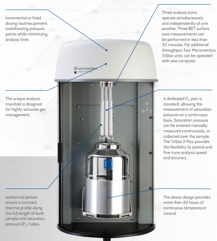 Micromeritics®TristarII加上是一个款全自动表和孔隙率分类,可提供快速,高通量,高精度的分类。三个装饰率高了常规料分布的速度和效率,当的准确性,分裂和数码压缩压缩。