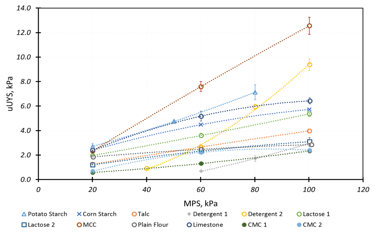单轴无侧限屈服强度(uUYS)是打破或破坏先前固结的无侧限粉末柱所需的应力的测量结果。uUYS类似于无侧限屈服强度(uy),后者是从旋转剪切测试仪中得出的参数。但是,应该注意的是,由于单轴和双轴旋转测试仪的固结和失效方案不同,因此uUYS的值并不总是与uy的值相同。