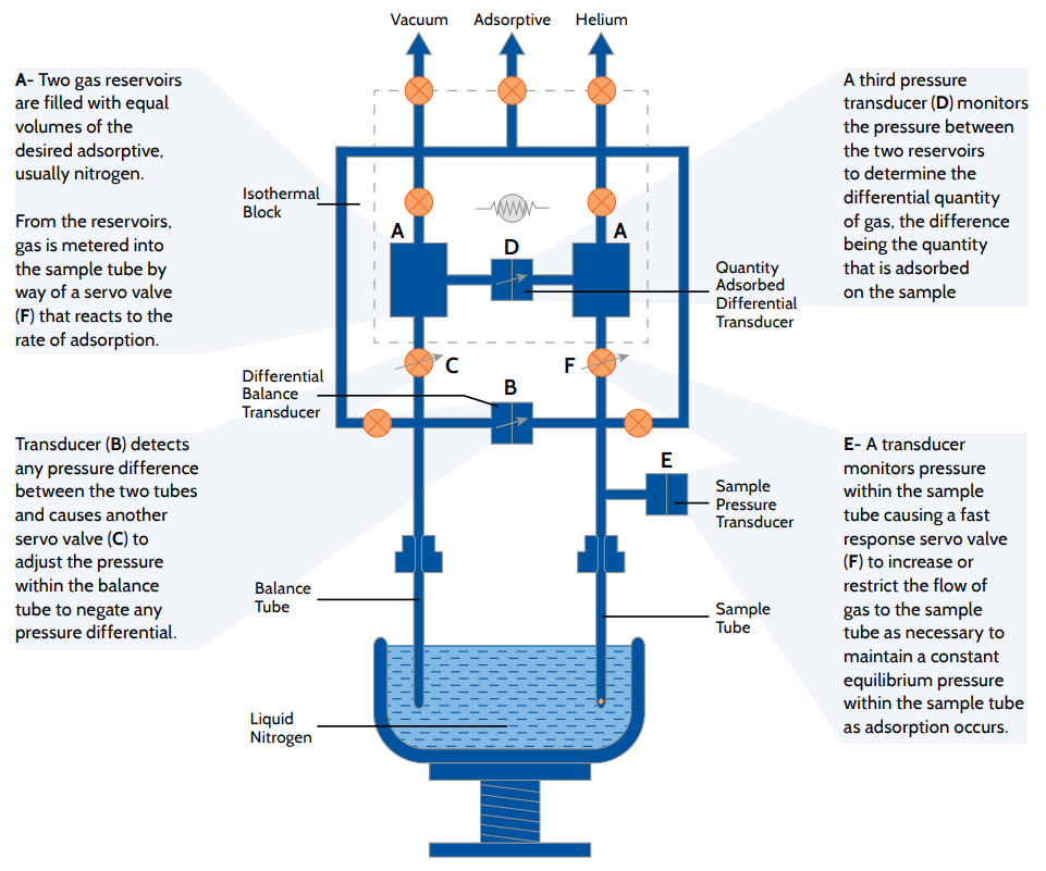 - 精度:Micromeritics 发明了平衡管设计,该设计消除了由热梯度变化或初始的错误自由空间测量结果引起的自由空间误差。 Gemini 允许在不需要氪气的情况下进行低表面积测量,并且伺服阀的使用可控制气体流入样品管的速率,以准确地达到目标压力而不会出现压力过冲。