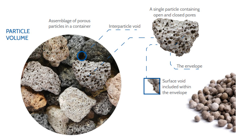 | 密度类型 | 定义 | 物质体积 | 开孔体积 | 闭孔体积 | 颗粒间体积 | 外部空隙体积 | 所用仪器 |