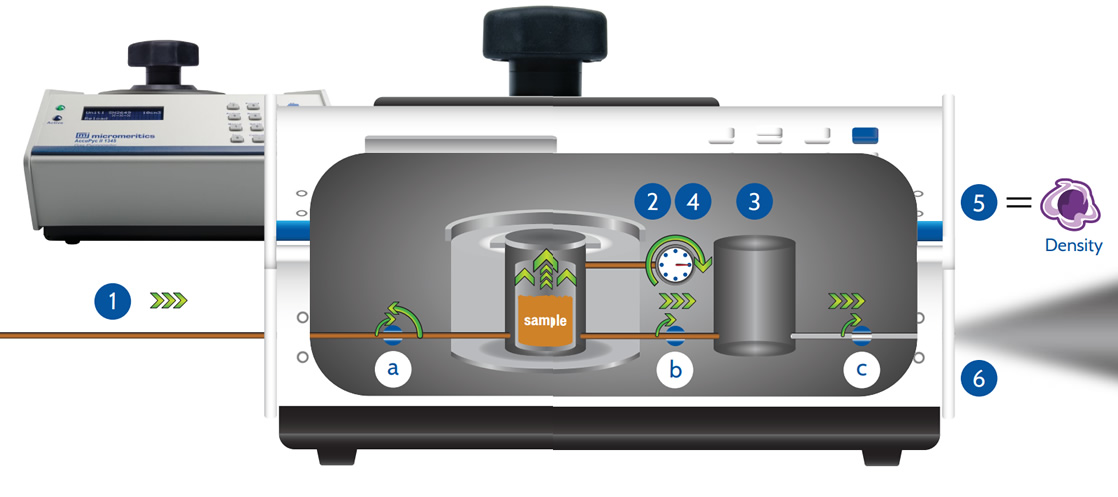 这种技术使用气体置换法来准确地测量体积。氦气或氮气等惰性气体用作置换介质。将样品密封在体积已知的仪器样品室内,将适当的惰性气体注入其中,然后再将惰性气体扩散到另一个精确的内部体积内。根据向样品室注入气体时及之后将其排放到另一个空室时观察到的压力,可计算出样品的固相体积。氦气分子可迅速填充直径小至 1 埃的孔内,