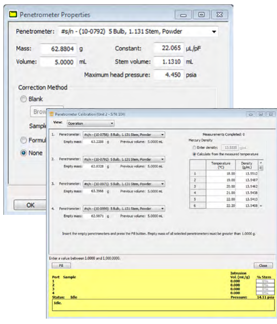 与仅使用环境温度下的汞密度的竞品系统不同,AutoPore V会自动测量实际汞温度,以便在操作条件下准确计算密度。